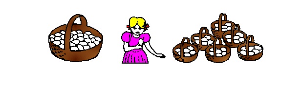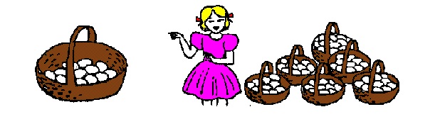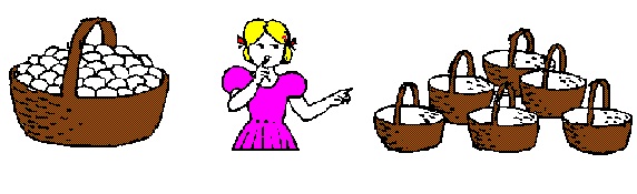 Observemos uma criança que tenta resolver concretamente aqueles problemas. Ela poderá enfrentar a primeira situação assim: observa o cesto cheio de ovos, olha para os seis cestos vazios, faz uma estimativa e resolve colocar 6 ovos em cada cesto.