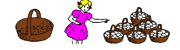 Olha o que sobrou e distribui mais 1 ovo para cada cesto. Finalmente põe 1 ovo em cada cesto e verifica que o cestão ficou vazio.