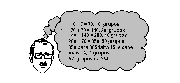 Um ano não bissexto tem 365 dias e a semana tem 7 dias. Queremos saber quantas semanas há em um ano, ou seja, quantos grupos de 7 há em 365. Este cálculo pode ser feito mentalmente.