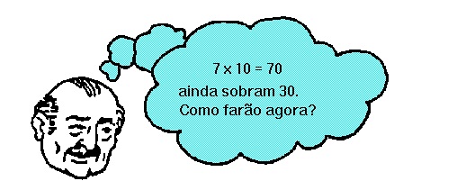 Após a primeira rodada cada criança tinha 10 balas e restavam 30 no saco: 100 = 7 x 10 + 30. Era possível prosseguir a distribuição. Após a segunda rodada cada uma tinha 13 balas e restavam 9 no saco: 100 = 7 x 13 + 9. Nesse momento, apesar de ser possível ainda prosseguir, os netos deram por encerrada a distribuição. Mas o avô pediu que prosseguissem e, após a terceira rodada, cada um tinha 14 balas. Restavam 2 no saco: 100 = 7 x 14 + 2.